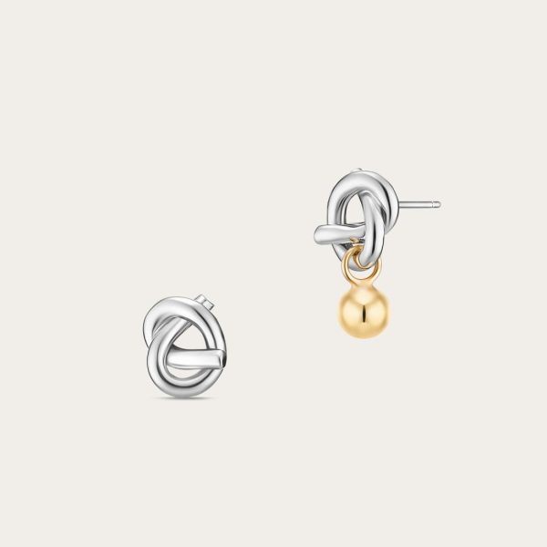 An asymmetrical pair of delicate, gold earrings in the shape of a knot – a motif of the Felicita collection. A silver ball is suspended on one earring. Their bold character is emphasised by the combination of silver and gold. Looks great paired with an ear cuff!