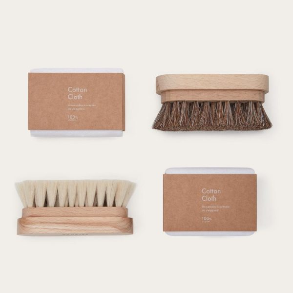 Our care accessory kit includes handcrafted wooden brushes for cleaning and polishing and two cotton cloths. All the brushes are handmade and stretched manually – all created in cooperation with the local Occupational Activity Institution to enable activity and professional development for people with disabilities, including the blind and visually impaired – please remember about this when you notice minor aesthetic imperfections on your product (not affecting its functionality).