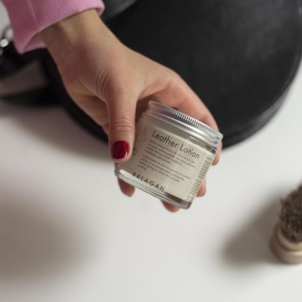The natural waxes contained in caring balm gently nourish the leather and give it shine. The composition of oils will ensure its smoothness and protect against cracking. It also protects pigmentation. Because of the waxes inside, your balm might get compacted and stiff when you’re not using it oftenly. Don’t worry! It will melt quickly in your hands.